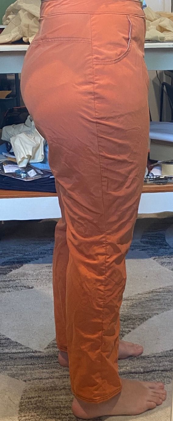 Notice that I'm missing back pockets, but I've got front pockets, a zip fly, and a curved waistband. The fit is okay, but it's too tight in the booty and the front crotch will haunt me forever.